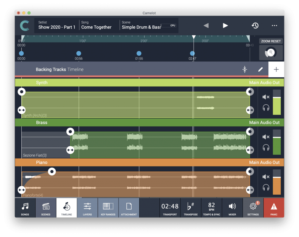 - Attach audio backing tracks. With Camelot’s Timeline feature, you can set backing tracks and automate transitions between sound, MIDI, and attachment configurations simultaneously.