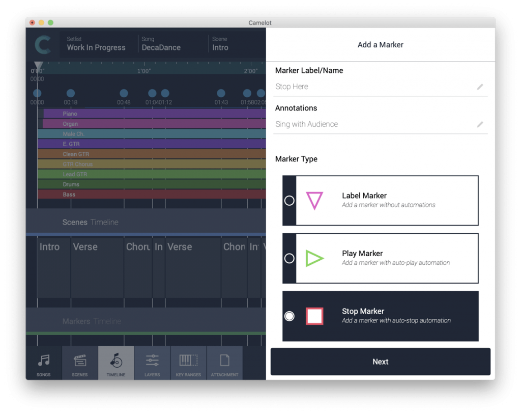 - Attach audio backing tracks. With Camelot’s Timeline feature, you can set backing tracks and automate transitions between sound, MIDI, and attachment configurations simultaneously.